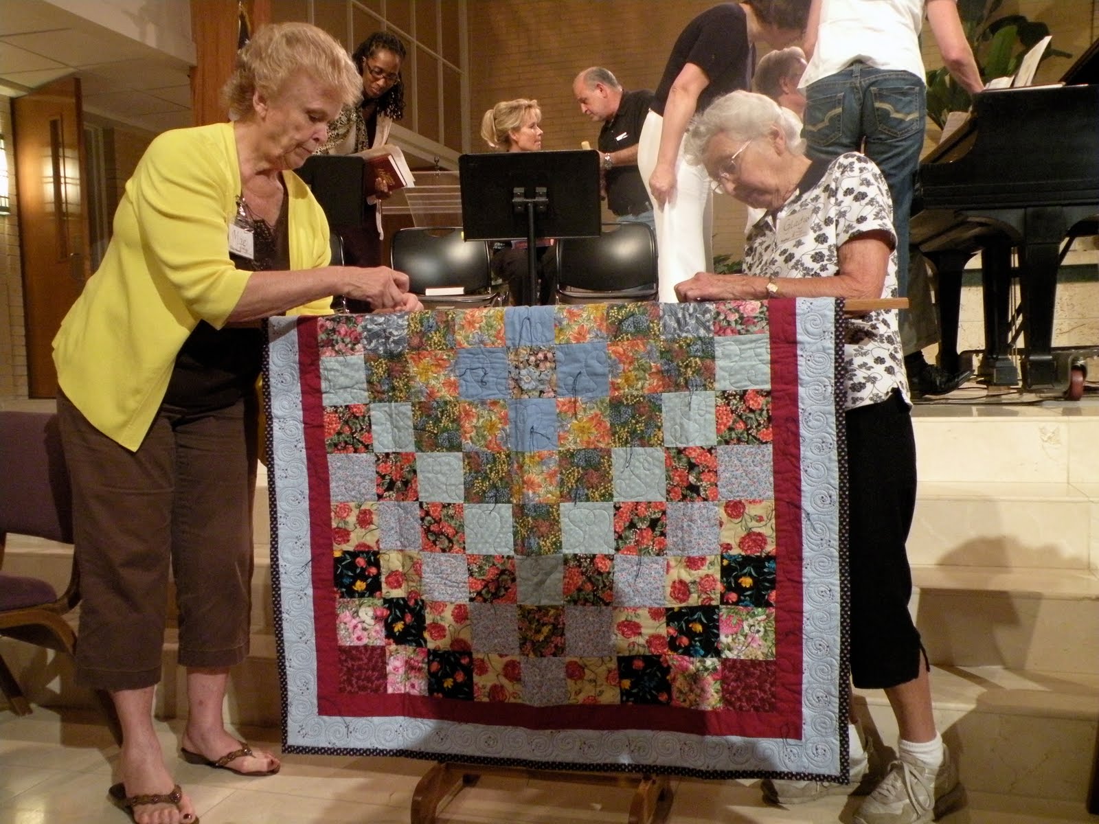 Mae Feldman (pictured on the left) is a member of the Prayer&Squares quilting ministry and faithfully coordinates Wednesday night’s quilt requests.